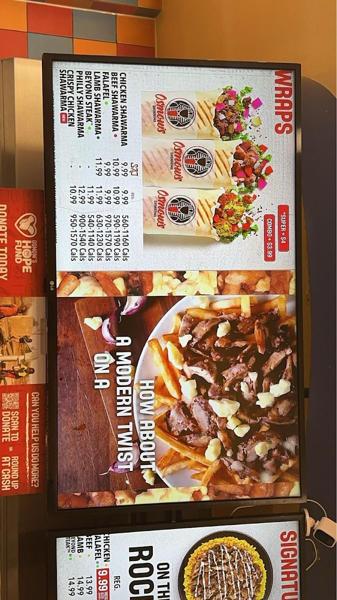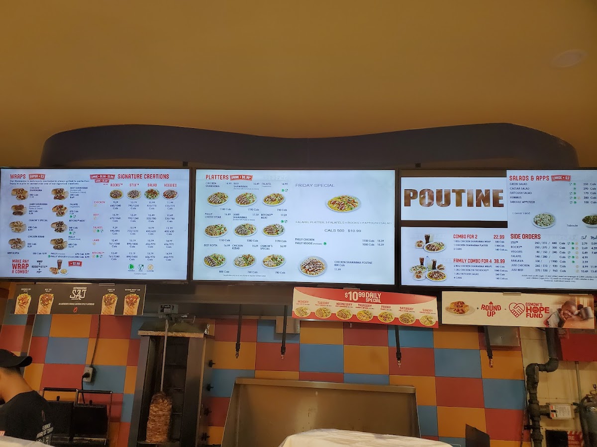 My personal favorite dish at Osmow's is their signature shawarma wrap. Made with tender meat, fresh vegetables, and creamy tahini sauce, it's a satisfying and delicious option for lunch or dinner. The friendly staff and cozy atmosphere make dining at Osmow's a truly enjoyable experience.